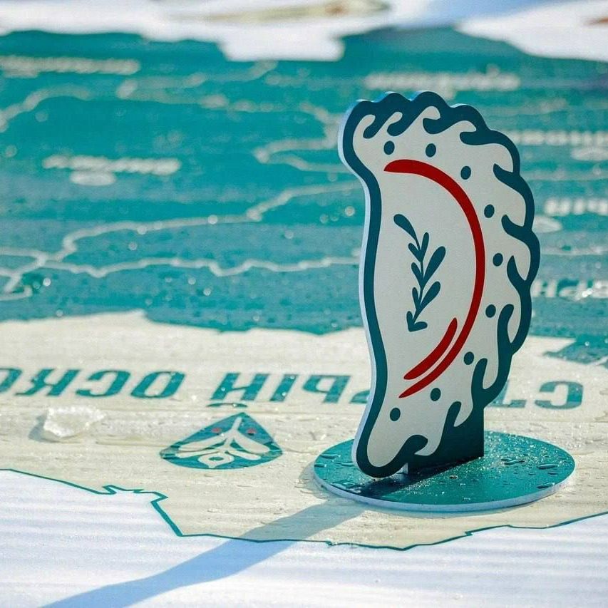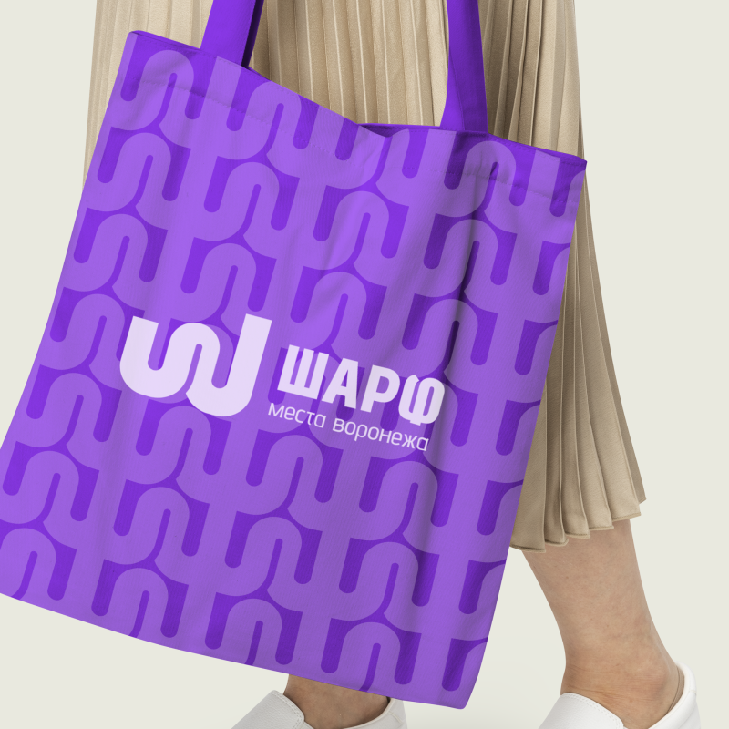 Логотип включает элементы, связанные с путешествиями и открытиями (например, карта, маршруты, непосредственно шарф), в стиле, который передает легкость, интерактивность и любовь к городу.