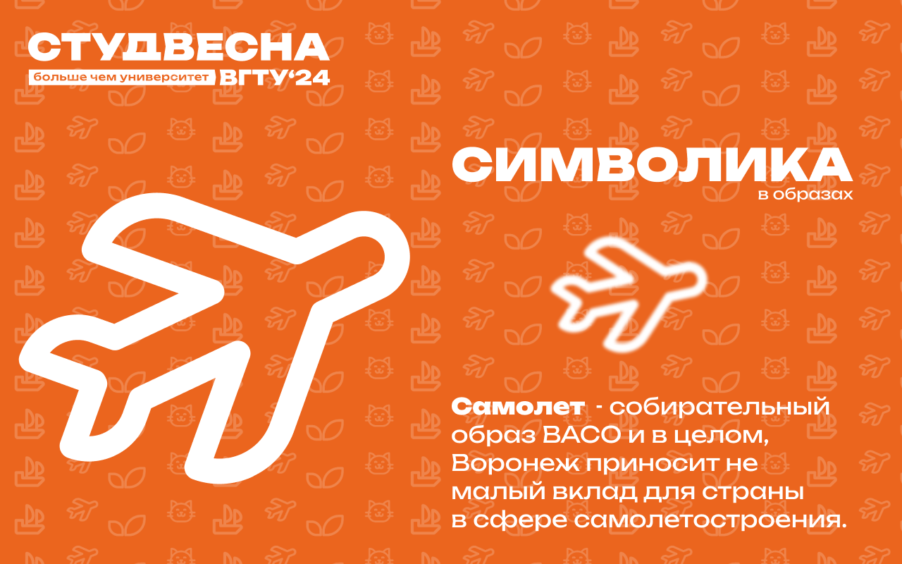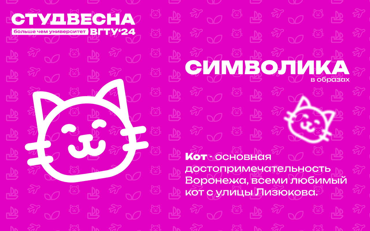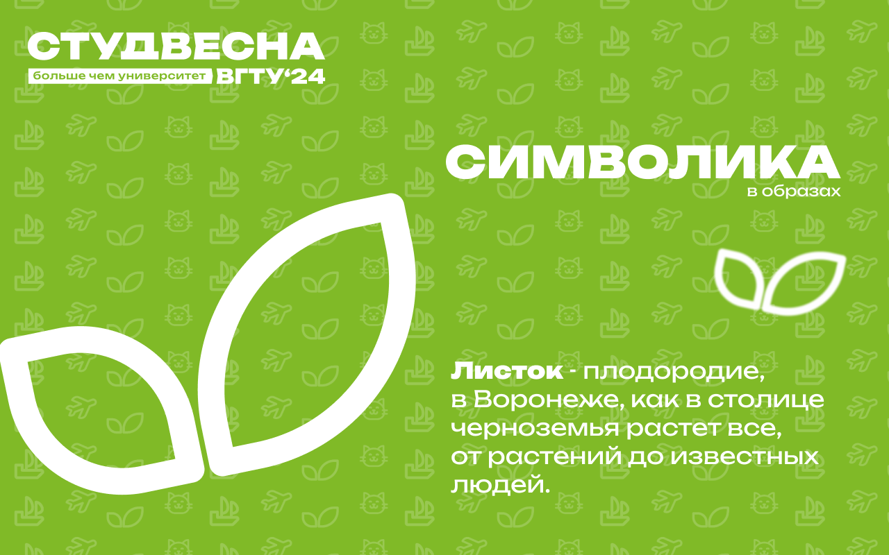 Логотип и брендинг выполнены в виде стилизованной композиции, объединяющей символы Воронежа (корабль, самолет, листок, кот) в единый графический паттерн, дополненный энергичной цветовой палитрой и современным шрифтом, что передает многогранность студенческой жизни и наследие региона.