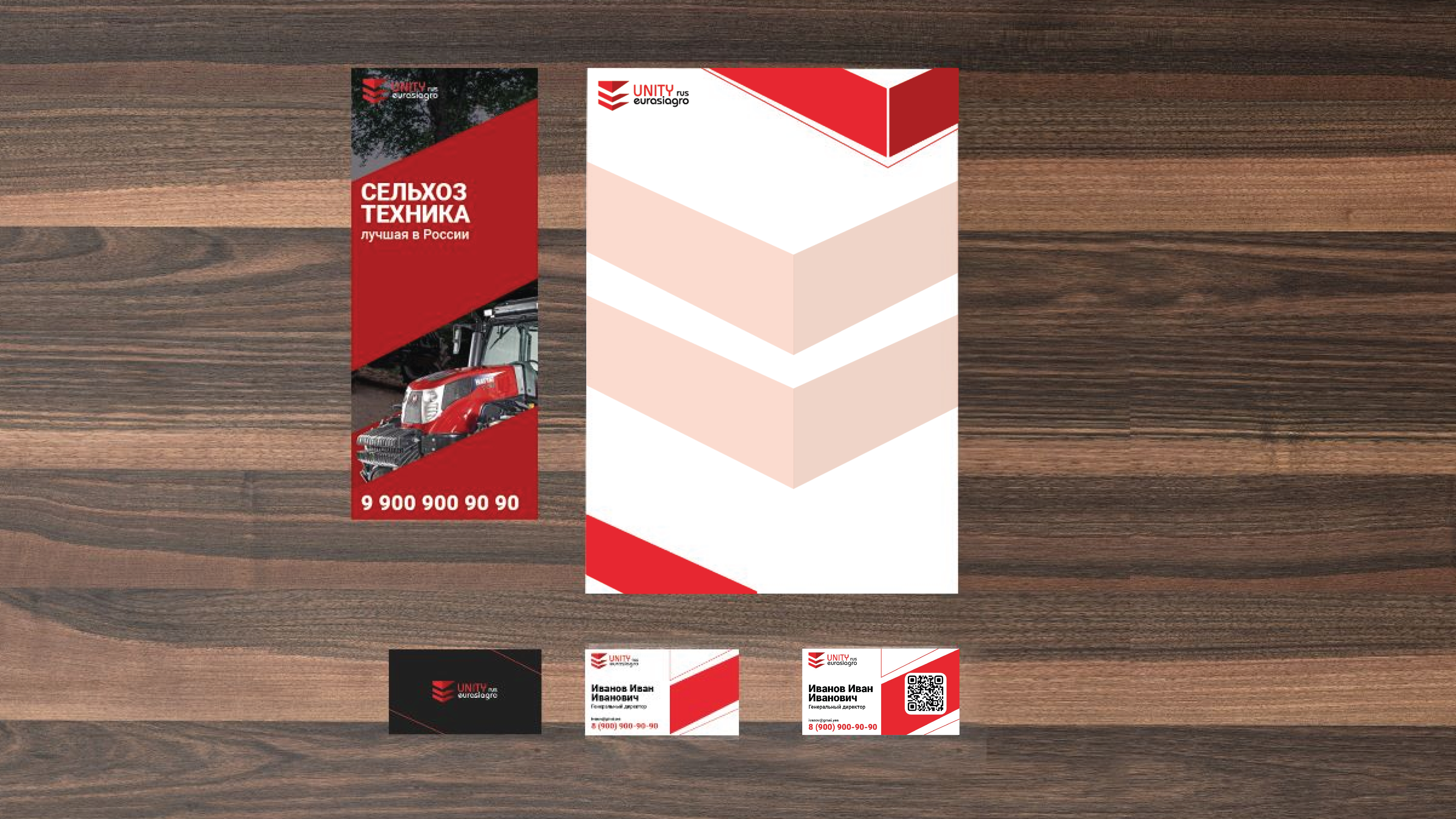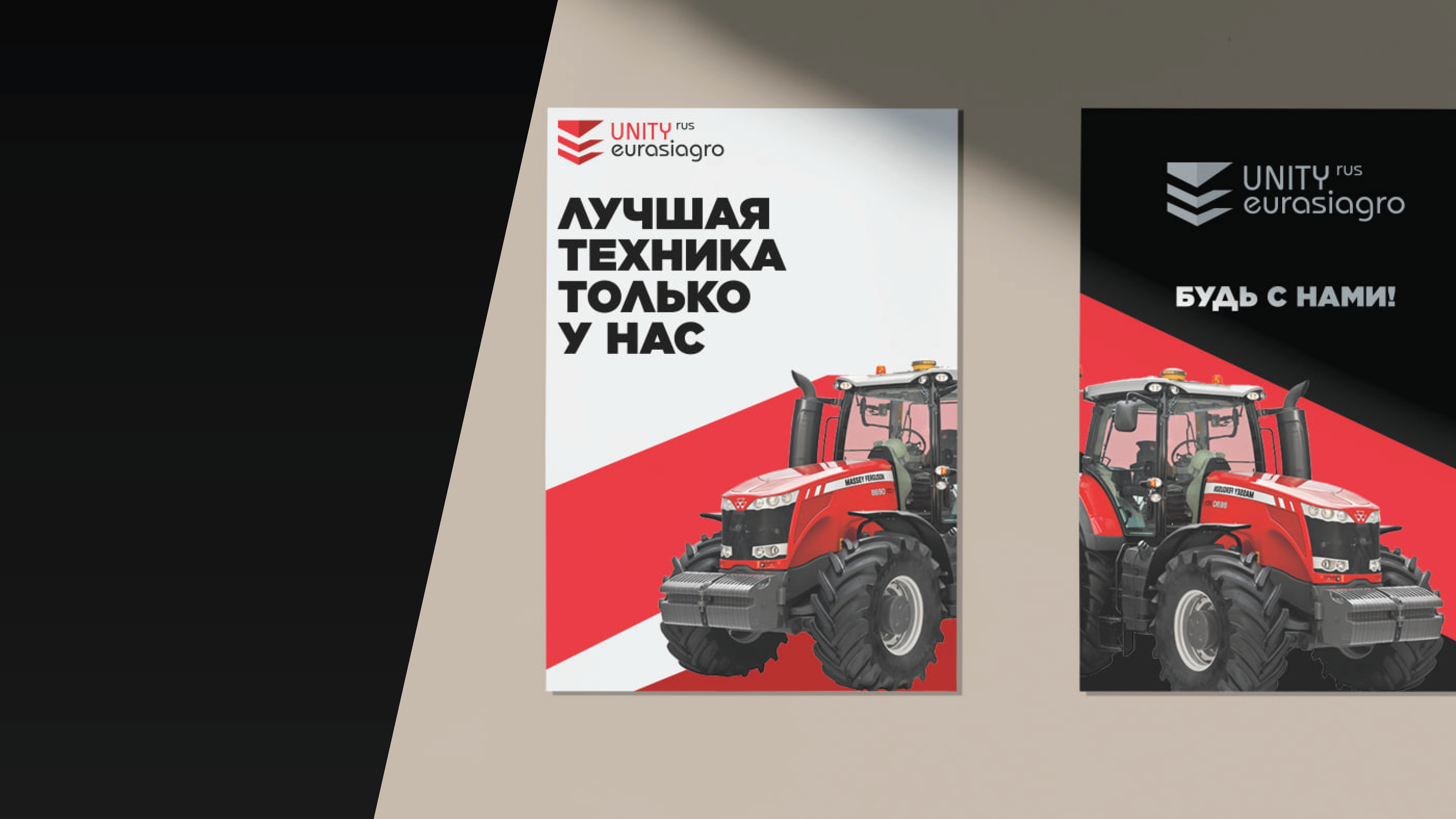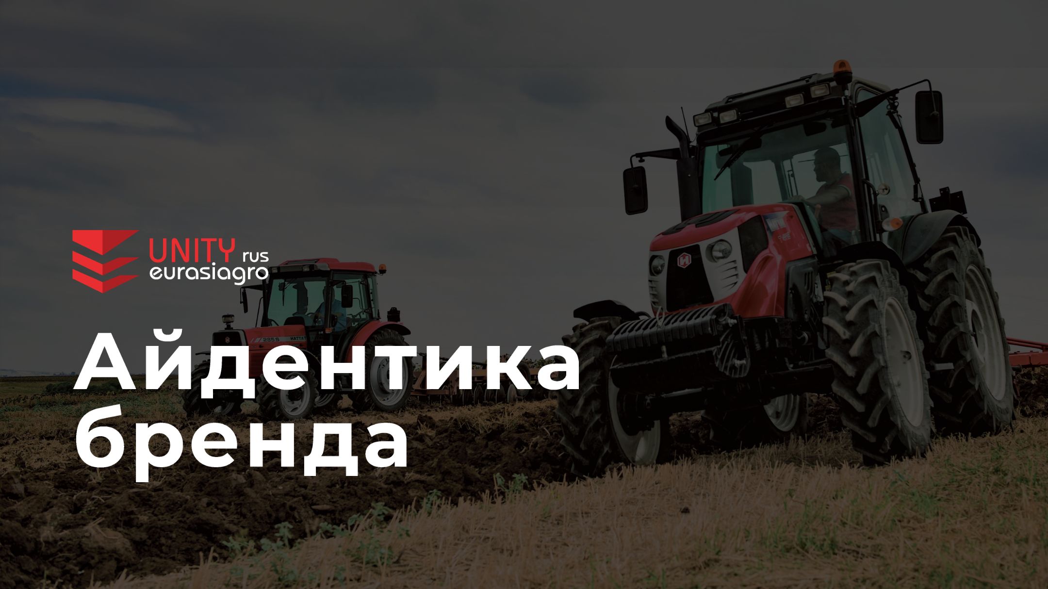 Логотип выполнен в виде стилизованного короба поставок оборудования, дополненного надписями "UNITY" и "eurasiagro", в цветах, сочетающих промышленные (серый, красный), что подчеркивает технологичность, единство и глобальную экспертизу, так же в логотипе приписка "rus", что в свою очередь показывает обширность компании.