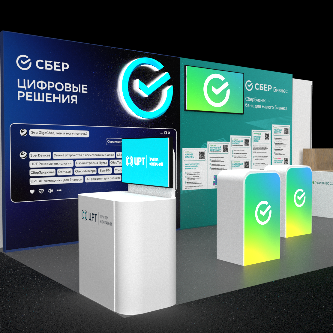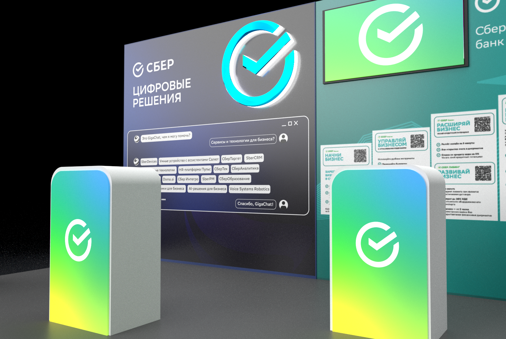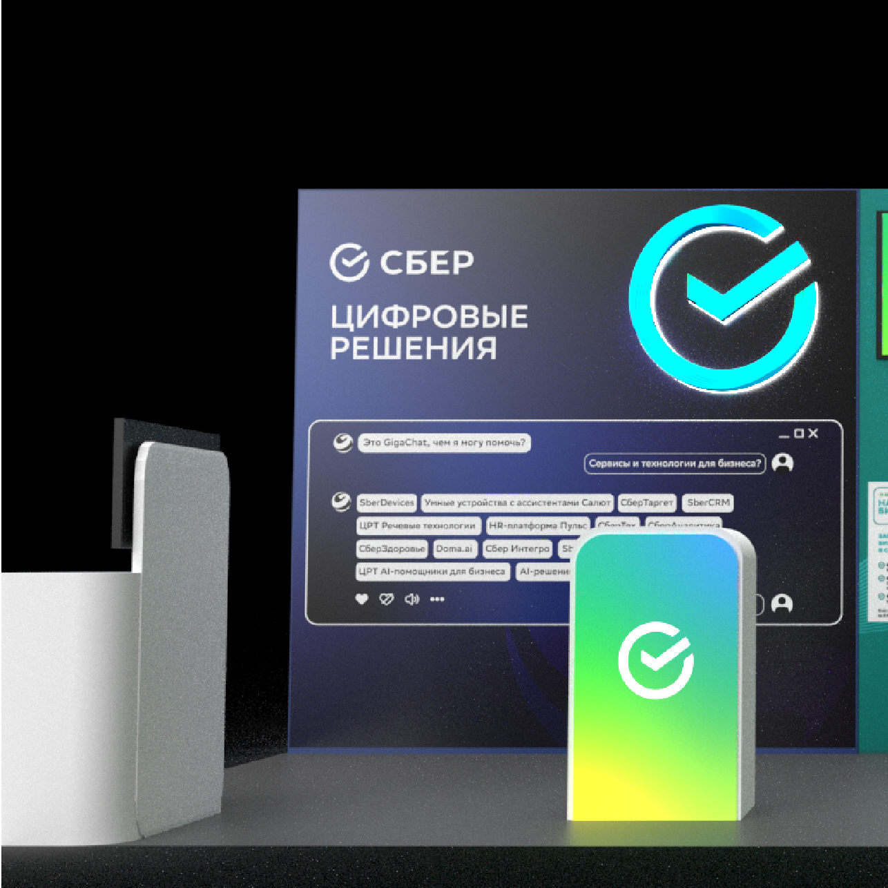 Разработать стенд Сбера для форума "цифроземье", который передает технологичность, инновации и современный подход компании к финансовым услугам. Работал в команде с коллегами.