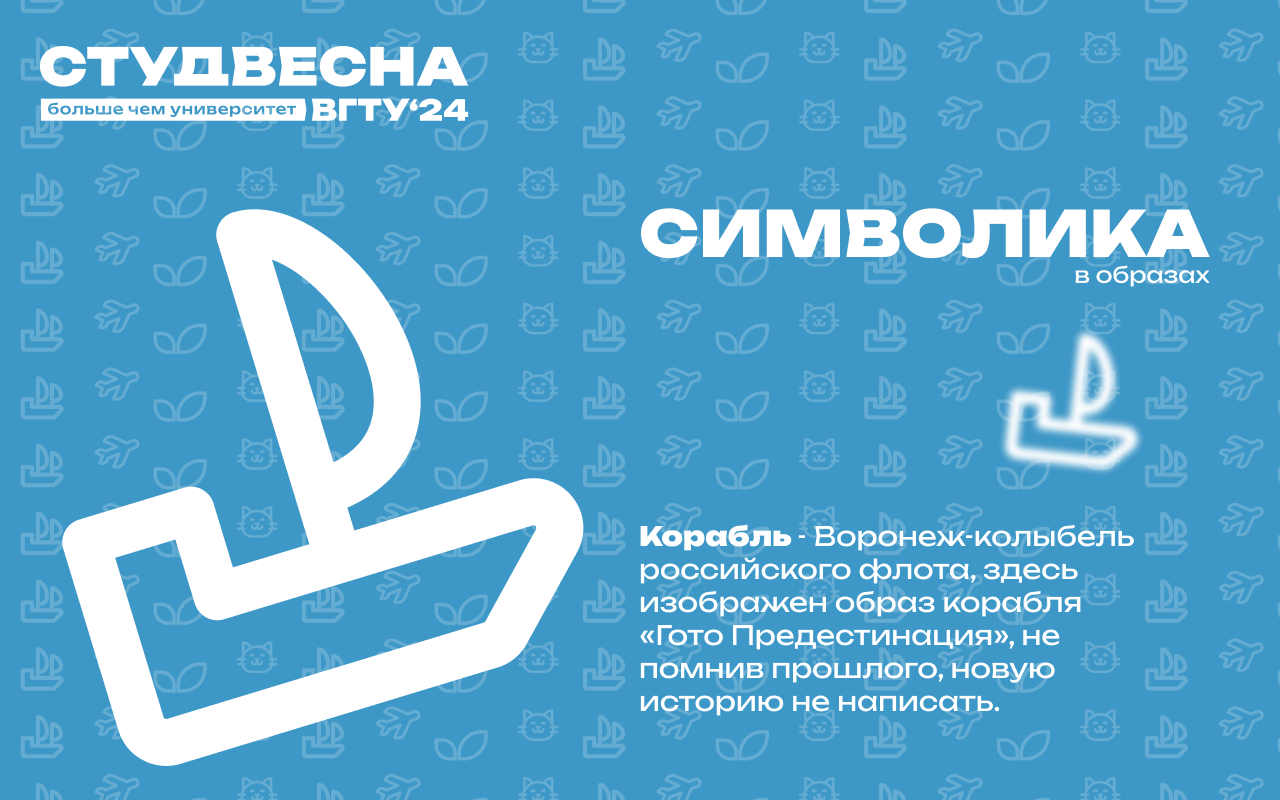 Разработать логотип и брендинг для фестиваля "Студвесна ВГТУ’24", объединяющий символы Воронежской области (корабль «Гото Предестинация», самолет ВАСО, листок плодородия, кот с улицы Лизюкова) и отражающий идею университета как центра знаний, творчества и эмоций.